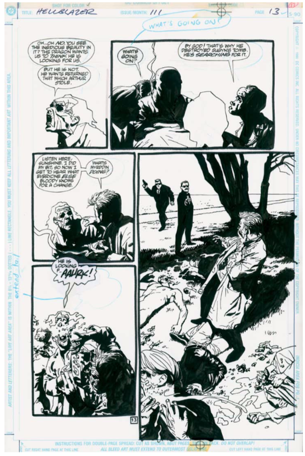 “Hellblazer was absoluut de reeks waarin ik als tekenaar volwassen ben geworden en mijn eigen stem heb gevonden. Ik doe een paar losse thumbnails op de pagina, zodat ik een goed idee heb van waar de tekstballonnen moeten komen en welke fotoreferenties ik nodig heb. Daarna meteen met inkt beginnen houdt het proces voor mij levendig. Als ik eerst alles gedetailleerd in potlood zou tekenen om er dan met inkt over te gaan, zou ik het gevoel hebben dubbel werk te doen.”