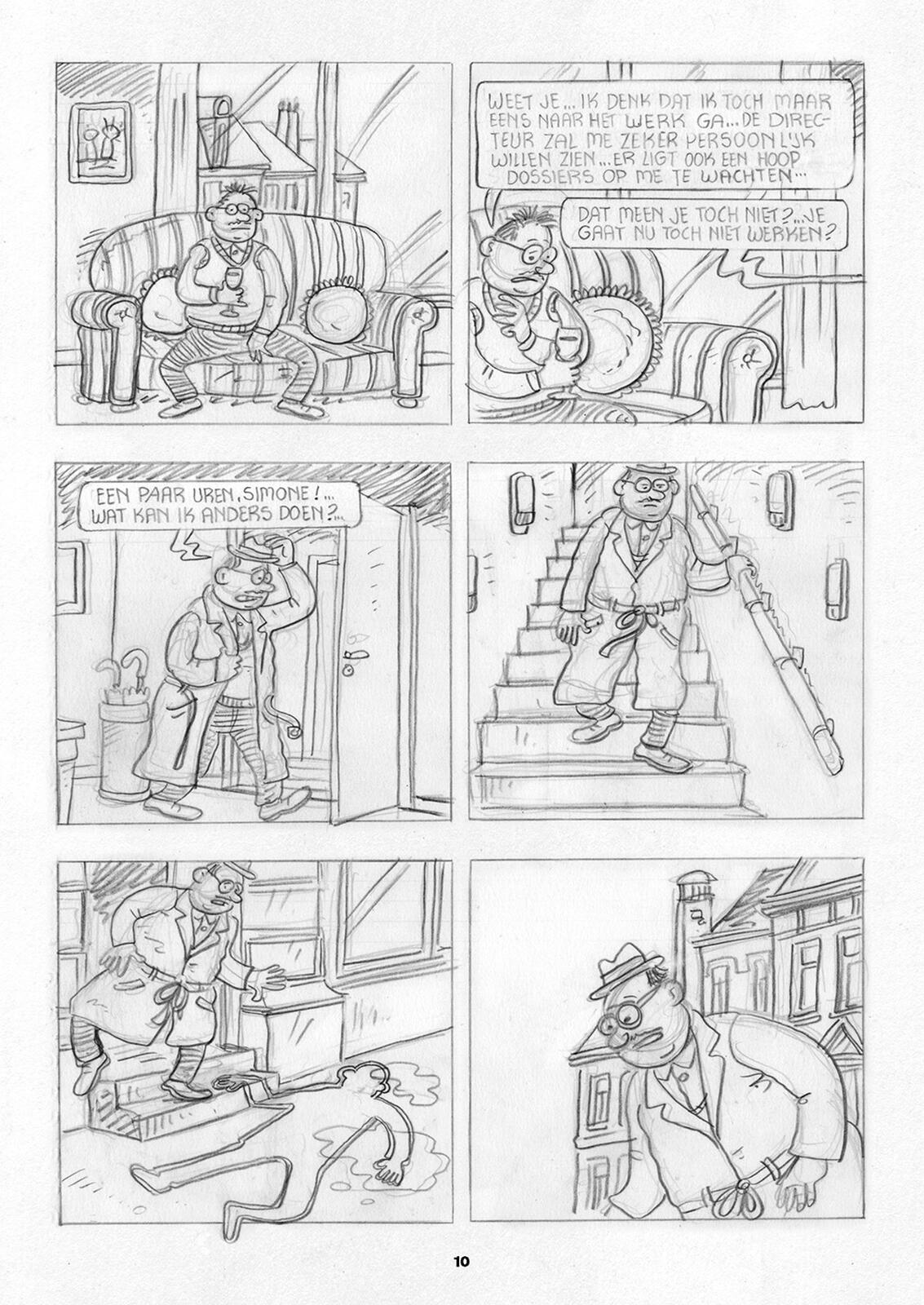 Willy: “Het meeste is echt gebeurd. Die beelden kwamen gewoon. Het verhaal heeft zichzelf gevormd, in een soort roes. Ik werkte eraan naarmate een hoofdstuk zich opdrong. Van bij aanvang wist ik: dit worden acht hoofdstukken van twintig pagina’s. Voor de teksten heb ik mijn broer erbij gehaald. Samen hebben we al tekenend en schrijvend het rouwproces doorgemaakt. Ik weet dus niet of ik er wel zoveel verdienste aan heb, want het boek kwam uit zichzelf. Het was een totaal andere manier van werken dan bijvoorbeeld Urbanus. Een andere benadering, snelheid - dat vloog op het blad -, ik zat zelfs anders aan mijn bureau. Meer rechtop.”